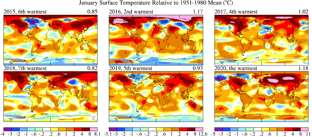 Mapa de las anomalías climáticas de los últimos seis meses de enero (base 1951-1980). Fuente: NASA GISS. (Climat-global)