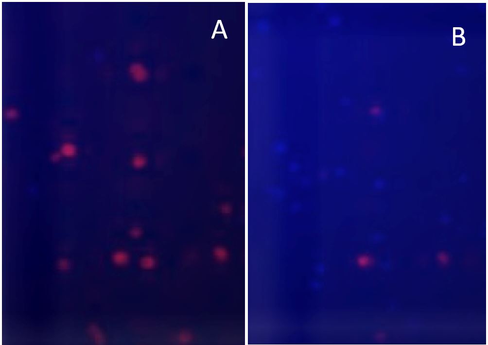 Imagen de microscopía de fluorescencia de los microorganismos de la cepa ChISG: Los organismos que aún no han captado uranio se ven en rojo por la fluorescencia de su clorofila (A), pero a medida que acumulan uranio en su interior van adquiriendo un tomo más azulado (B). Foto: Baselga-Cervera et al.