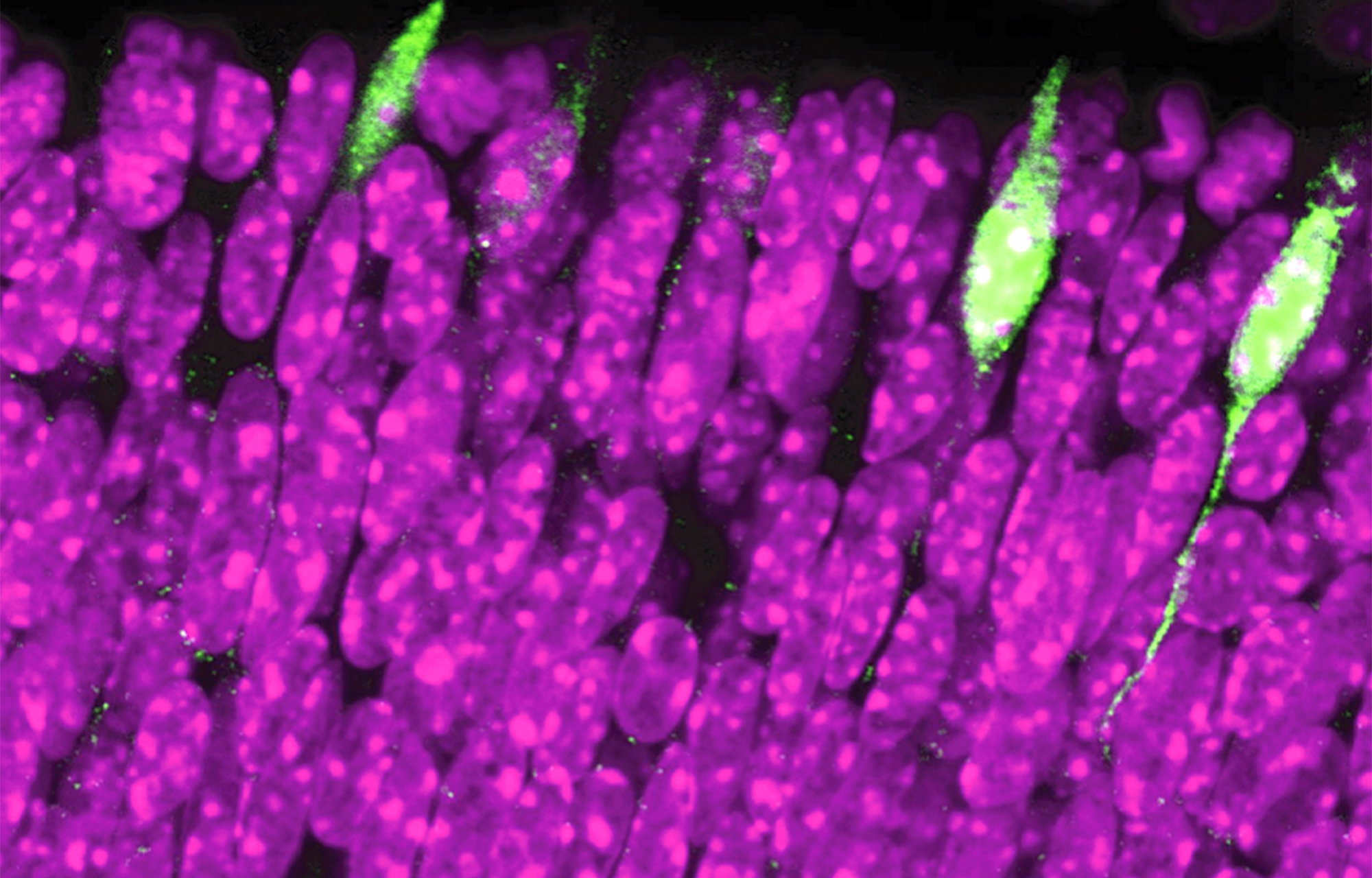 Células fotorreceptoras responsables de la visión del color. Al secuenciar una célula cada vez, los investigadores identificaron un gen (Rbp4) presente en una pequeña cantidad de células (en verde). En púrpura, fotorreceptores en los que el gen Rbp4 no está activado. © UNIGE, Pierre Fabre