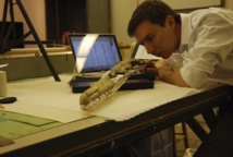 Dan Ksepka examina el cráneo fosilizado de ‘Pelagornis sandersi’. Imagen: Dan Ksepka. Fuente: NESCent (Centro Nacional de Síntesis Evolutiva).