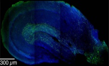 Imagen que muestra las neuronas inhibitorias LRIPs (en verde) extendiéndose desde la corteza entorrinal (en la parte inferior derecha) hacia el hipocampo. Se ha descubierto que las LRIPs forman parte de un sofisticado mecanismo crítico en la formación de recuerdos de contexto. Imagen: Jayeeta Basu. Fuente: Mortimer B. Zuckerman Mind Brain Behavior Institute.