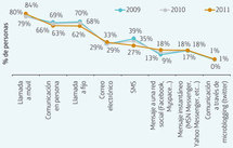 Durante el año 2011 se puede hablar de dos medios que reducen considerablemente su peso como medio de comunicación: el teléfono fijo que pierde 6 puntos porcentuales en penetración y el SMS que pierde 8 puntos porcentuales. Se trata de una evolución hacia otros medios que crecen de forma notable como el teléfono móvil o mensajes a una red social que aumentan 5 puntos porcentuales cada uno de ellos. Además de este movimiento hacia los nuevos canales, también se observa como los ciudadanos y muy especialmente los jóvenes son más multicanal de lo que eran hace tan solo 4 años, por ejemplo el segmento de las personas más jóvenes utilizan actualmente 4,2 canales de comunicación de media frente a 3,3 del año 2008.