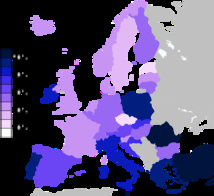 Porcentajes de creencia en Dios en Europa, a partir de datos del Eurobarómetro (2005). Fuente: Wikipedia.