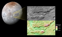 La parte inferior de la imagen muestra la topografía con código de colores. Las mediciones de la forma de esta figura dicen a los científicos que la capa de hielo de Caronte pudo haber estado al menos parcialmente en estado líquido en su historia temprana, y desde entonces ha vuelto a congelarse.