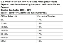 Este análisis, realizado sobre múltiples campañas de publicidad CPG on line, consistió en comparar las compras físicas en tiendas de marcas que realizan campañas de publicidad on line con el comportamiento de compra de aquellas tiendas sin este tipo de campañas, y reveló un aumento medio de un 21% en las ventas, con cinco de cada seis campañas generando un aumento positivo. Aproximadamente el 70% de las campañas generaron una subida de dos cifras, y en más del 40% la subida fue de un 30% como mínimo.