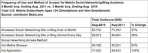 A partir de estos datos, se concluye que de aquellas personas que accedieron a sitios de redes sociales o blogs desde sus dispositivo móviles en agosto de 2011, el 80,3% leyó mensajes de gente que conoce personalmente, mientras que 69,5% publicó actualizaciones de su estado.