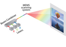Los láser de color Rojo, Verde y Azul son combinados y escaneados por el sistema MEMS. Foto: Lemoptix S.A