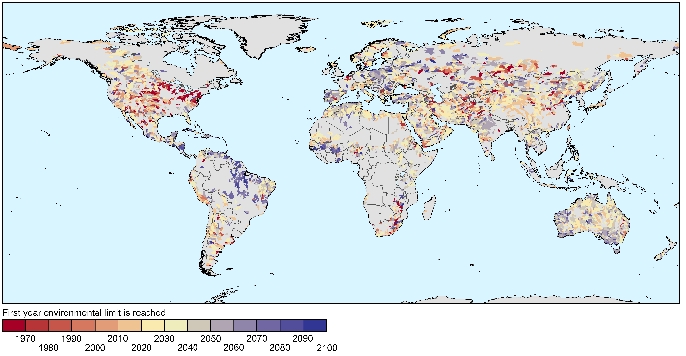 Este mapa muestra los años en los que el bombeo de agua subterránea afectó/afectará a la afluencia de agua subterránea a arroyos y ríos, hasta el punto de amenazar a los ecosistemas ribereños de agua dulce. Fuente: Deltares. Click sobre la imagen para ampliar.