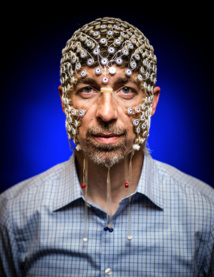 El profesor Barry Van Veen muestra, en su cabeza, la red de electrodos con la que se midió la actividad cerebral de los participantes mientras estos imaginaban o recreaban en su mente imágenes ya vistas. Imagen: Nick Berard. Fuente: Universidad de Wisconsin-Madison.