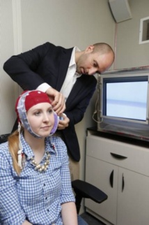 Robert Reinhart aplica estimulación eléctrica a una de las participantes en el estudio. Imagen: John Russell. Fuente: Universidad Vanderbilt.