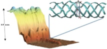 Imagen tomada con un microscopio de fuerzas atómicas de una molécula de G4-ADN depositada sobre una superficie de mica. La estructura atómica del G4-ADN se muestra arriba a la derecha. Fuente: UAM Gazette.