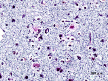 Corte de tejido cerebral de un enfermo de alzhéimer. Imagen: KGH. Fuente: Wikipedia.