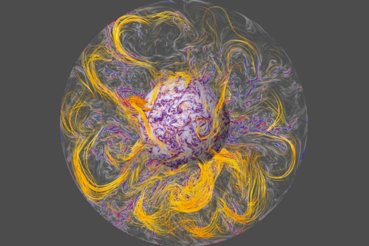 Así es como se aprecia el interior del núcleo de la Tierra según la simulación informática. Las líneas de fuerza del campo magnético (en naranja) se alargan por convección turbulenta (en azul y rojo). Las ondas hidromagnéticas se emiten desde el interior del núcleo y se propagan a lo largo de líneas de fuerza de campo hasta la superficie del núcleo, donde se enfocan para crear una agitación geomagnética. © Aubert et al./IPGP/CNRS Photo Library
