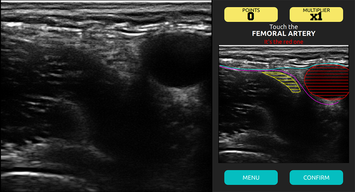 La aplicación capacita a los usuarios en el arte de identificar nervios, así como puntos de referencia cercanos, en las imágenes de ultrasonido. La tarea es colocar una aguja cerca del nervio e inyectar anestésicos alrededor de ella de modo que la pierna pueda ser operada.
