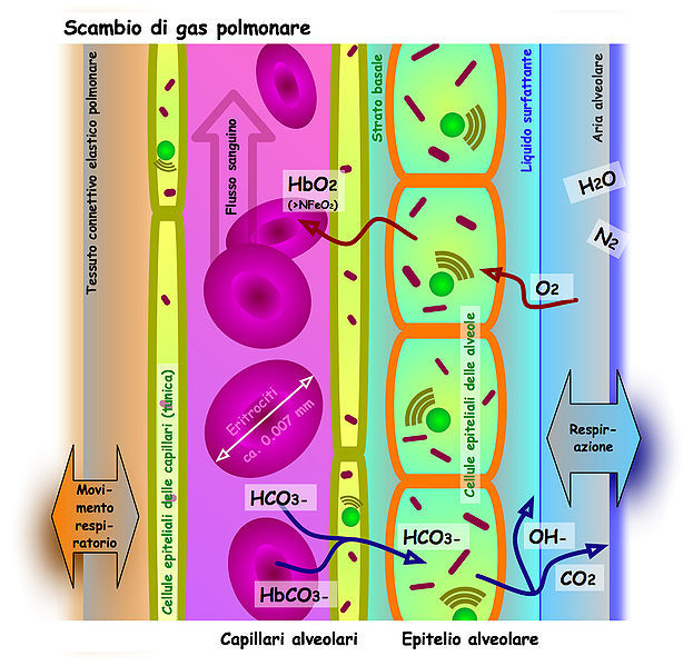 Diagrama del intercambio pulmonar de gases en la respiración. Peter Forster. Wikipedia.