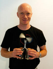 Ole Martin Løvvik, uno de los autores de la investigación, demuestra la tecnología termoeléctrica con una copa fría y un vaso de agua caliente. Gracias a la diferencia de temperaturas, se puede generar suficiente energía como para hacer funcionar un ventilador. Fuente: Yngve Vogt.