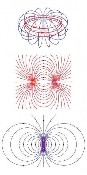 En un anapolo (figura de arriba), el campo electromagnético está restringido a la zona más cercana. En cambio, en los dipolos eléctrico (en medio) y magnético (abajo), el campo se expande indefinidamente. Imagen: Michael Smeltzer. Fuente: Universidad de Vanderbilt.