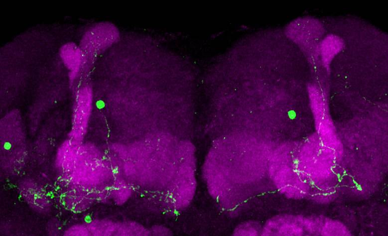 Parte del cerebro (en magenta) de la mosca de la fruta. La etiqueta genética ilumina (en verde) las neuronas que activamente crean y almacenan un recuerdo. Crédito: AG Pielage. TUK.