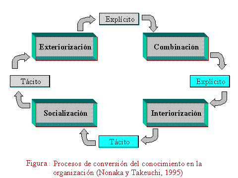 Es un proceso de interacción entre conocimiento tácito y explícito que tiene naturaleza dinámica y continua. Se constituye en una espiral permanente de transformación ontológica interna de conocimiento, desarrollada siguiendo 4 fases que podemos ver de forma gráfica en la siguiente figura:
