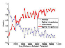Gráfico de cómo la amistad (línea morada) es más probable cuando la distancia es menor. Fuente: RPI.