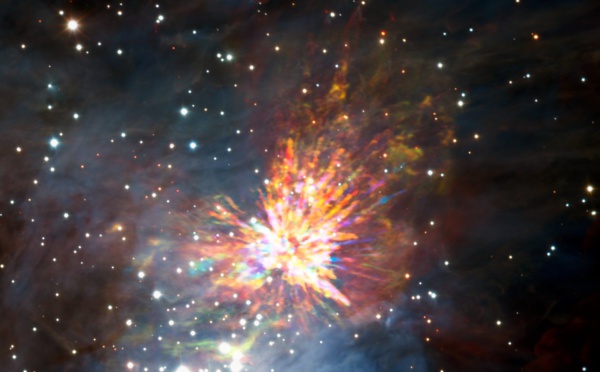 La formación de estrellas puede ser un proceso violento y explosivo, como una versión cósmica de fuegos artificiales con serpentinas gigantes que salen disparadas a más de 150 kilómetros por segundo en todas direcciones, extendiéndose a casi un año luz de extremo a extremo. Esta interacción cataclísmica libera tanta energía como la que emitiría el Sol en 10 millones de años, han descubierto astrónomos del ESO.