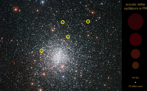 Astrofísicos del Reino Unido han medido la edad de estrellas muy antiguas, pertenecientes al cúmulo M4, captando las oscilaciones acústicas de su interior.Mediante una técnica llamado astrosismología, han observado cambios minúsculos en el brillo, causados por el sonido atrapado en el interior de los astros.