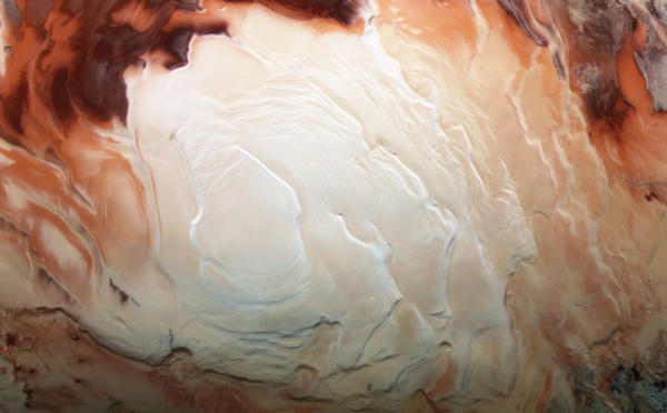 La sonda Mars Express ha fotografiado remolinos marrones y blancos con apariencia de capuchino en la superficie de Marte. El color blanco se lo da la capa de hielo que cubre el polo sur del planeta, formada por agua y dióxido de carbono, y que se combina con los colores rojizos típicos del planeta para formar curiosas imágenes.