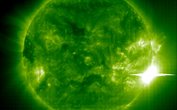 Una imagen del Sol obtenida en 2003 por la sonda SOHO, de la ESA y la NASA, muestra el episodio más prolongado de actividad solar del que se tienen registros. En la erupción fotografiada se liberó una cantidad de energía equivalente a un billón de bombas de Hiroshima, mil millones de toneladas de materia a una velocidad 8,2 millones de kilómetros por hora.