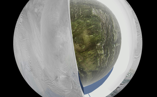 El satélite Encélado, de Saturno, contiene un océano de agua líquida a unos 40 kilómetros por debajo de su superficie. Así lo han observado científicos estadounidenses e italianos a partir de datos de la sonda Cassini (de la NASA, la ESA y la Agencia Espacial Italiana), que muestran una asimetría gravitatoria entre el hemisferio norte y sur, sólo explicable con la presencia de un material distinto en su interior.
