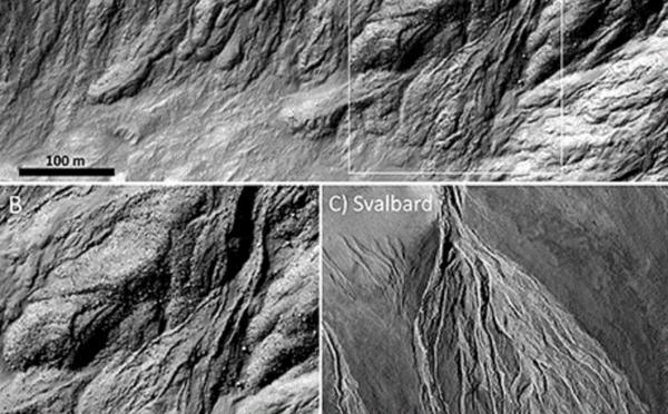 Un cráter marciano formado hace 200.000 años demuestra que hubo agua líquida en esa época tan reciente, muy posterior a la última edad de hielo del planeta, que se estima tuvo lugar hace 400.000. El cráter se formó por flujos masivos de sedimentos y agua, que se habían acumulado en pendientes, y que acabaron cayendo cuesta abajo. Los investigadores, de la Universidad de Gotemburgo, han comparado las formas geológicas de Marte con las de una zona de Noruega.