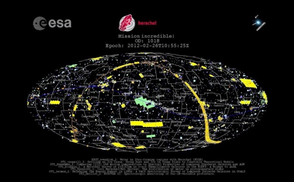 Científicos del Proyecto Herschel de la Agencia Europea del Espacio (ESA) han creado una animación que muestra en orden cronológico las más de 37.000 observaciones científicas realizadas por el observatorio espacial Herschel de la ESA a lo largo de toda su misión, desarrollada entre mayo de 2009 y abril de 2013, condensada en menos de un minuto.