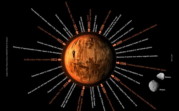 Los científicos de la Agencia Espacial Europea (ESA) han utilizado los datos proporcionados por la nave Mars Express en los últimos diez años para construir un atlas de los minerales que se encuentran en el Planeta Rojo. Entre ellos, los formados en agua, los formados por actividad volcánica, y los creados por la erosión. La formación de los minerales cuenta la historia del planeta.