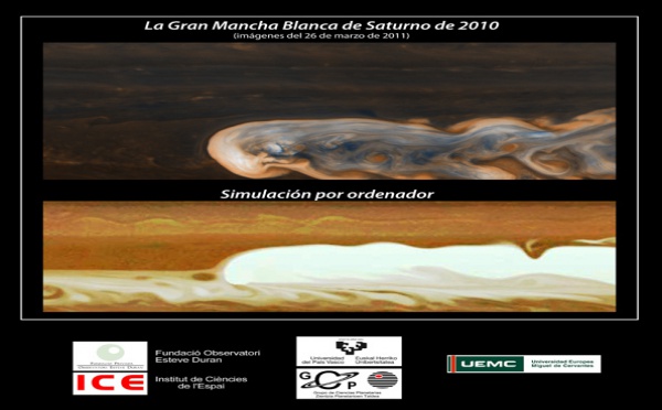 Científicos españoles han explicado el funcionamiento de las tormentas gigantes de Saturno. Cada 30 años terrestres, se produce una tormenta que altera temporalmente la atmósfera del planeta. Esta tormenta transporta ingentes cantidades de gas húmedo en vapor de agua a las capas más altas del planeta liberando enormes cantidades de energía que, al interaccionar violentamente con los vientos dominantes del planeta, producen un vendaval de 500 km/h.