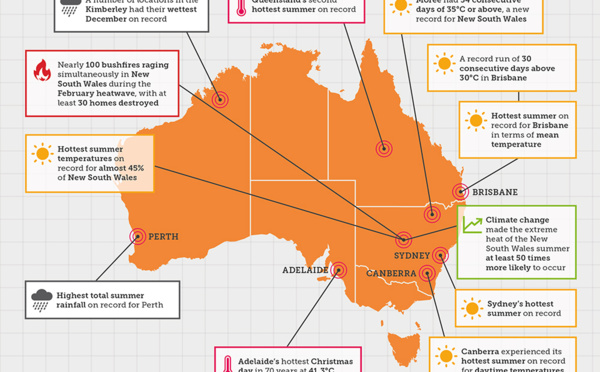 Australia ha vivido un infierno climático en el verano austral que acaba de concluir, con más de 205 récords meteorológicos. Numerosos incendios forestales han estado fuera de control, ofreciendo un espectáculo dantesco con murciélagos que caen de los árboles por efecto del calor. La temperatura ha aumentado 1ºC desde 1990 en todo el continente.