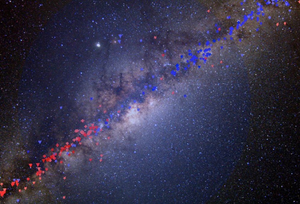 Los marcadores de la curva de rotación utilizados en la investigación, sobre una foto del disco de la Vía Láctea, vistos desde el hemisferio Sur. Los marcadores están en azul o en rojo dependiendo de su movimiento relativo respecto al Sol. El halo azul, esféricamente simétrico, representa la distribución de materia oscura. Imagen: Serge Brunier. Fuente: CSIC/Universidad de Escocolmo.
