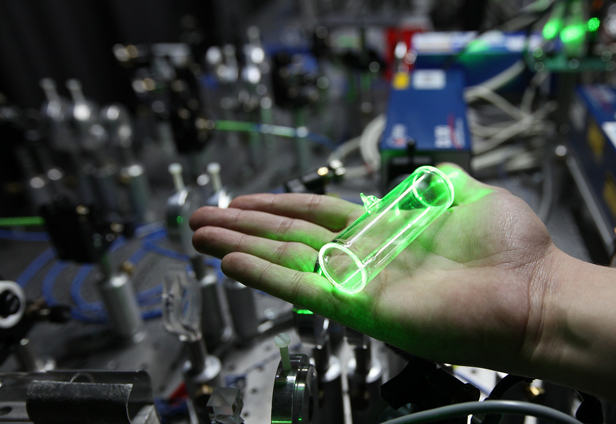 "Toda nuestra instalación experimental ocupa aproximadamente dos metros cuadrados de nuestra superficie de mesa óptica. Pero los acontecimientos más importantes tienen lugar en la propia memoria, en un cilindro de vidrio de aproximadamente 10 cm de longitud y con un diámetro de 2,5 cm. Cualquier persona que pueda esperar ver dentro del cilindro un diseño sofisticado digno de un circuito integrado de semiconductor quedará muy decepcionado: el interior de una celda está lleno sólo de pares de átomos de rubidio 87Rb a 60-80 grados Celsius ", explica Michal Dabrowski, un Estudiante de doctorado en UW Physics.