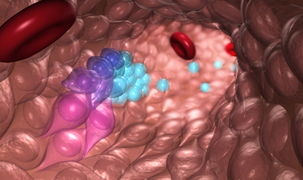 Las células madre y progenitoras de sangre emergen de células endoteliales hemogénicas durante el desarrollo embrionario normal. Las células azules (izquierda) emergen de las células progenitoras y hematapoyéticas emergentes. / O'Reilly Science Art