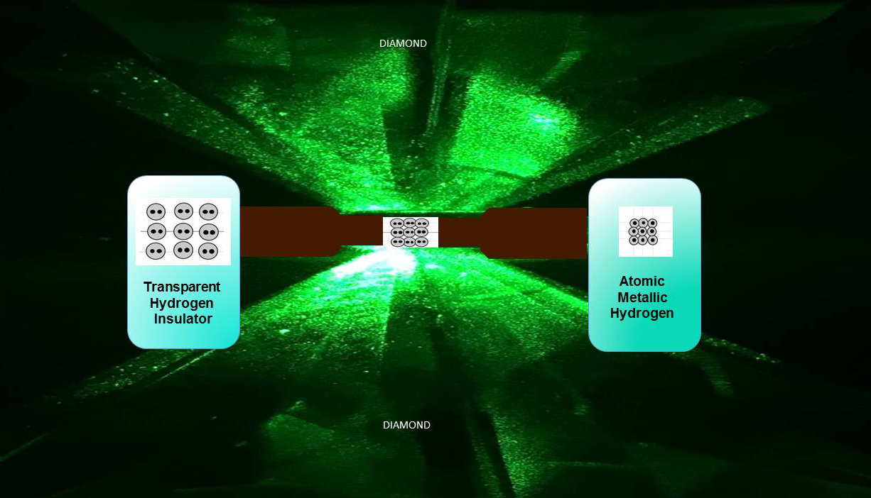 Bajo estas presiones extremas, el hidrógeno molecular sólido comienza a dividirse y las moléculas disociadas se transforman en un hidrógeno atómico que es un metal.