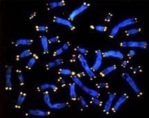 Los linfocitos (en azul) terminan en los telómeros (amarillos), más cortos en ancianos y personas que sufren estrés crónico. En estos últimos, la responsable sería la cortisona, la hormona que genera el organismo en situaciones de estrés. Fuente: U