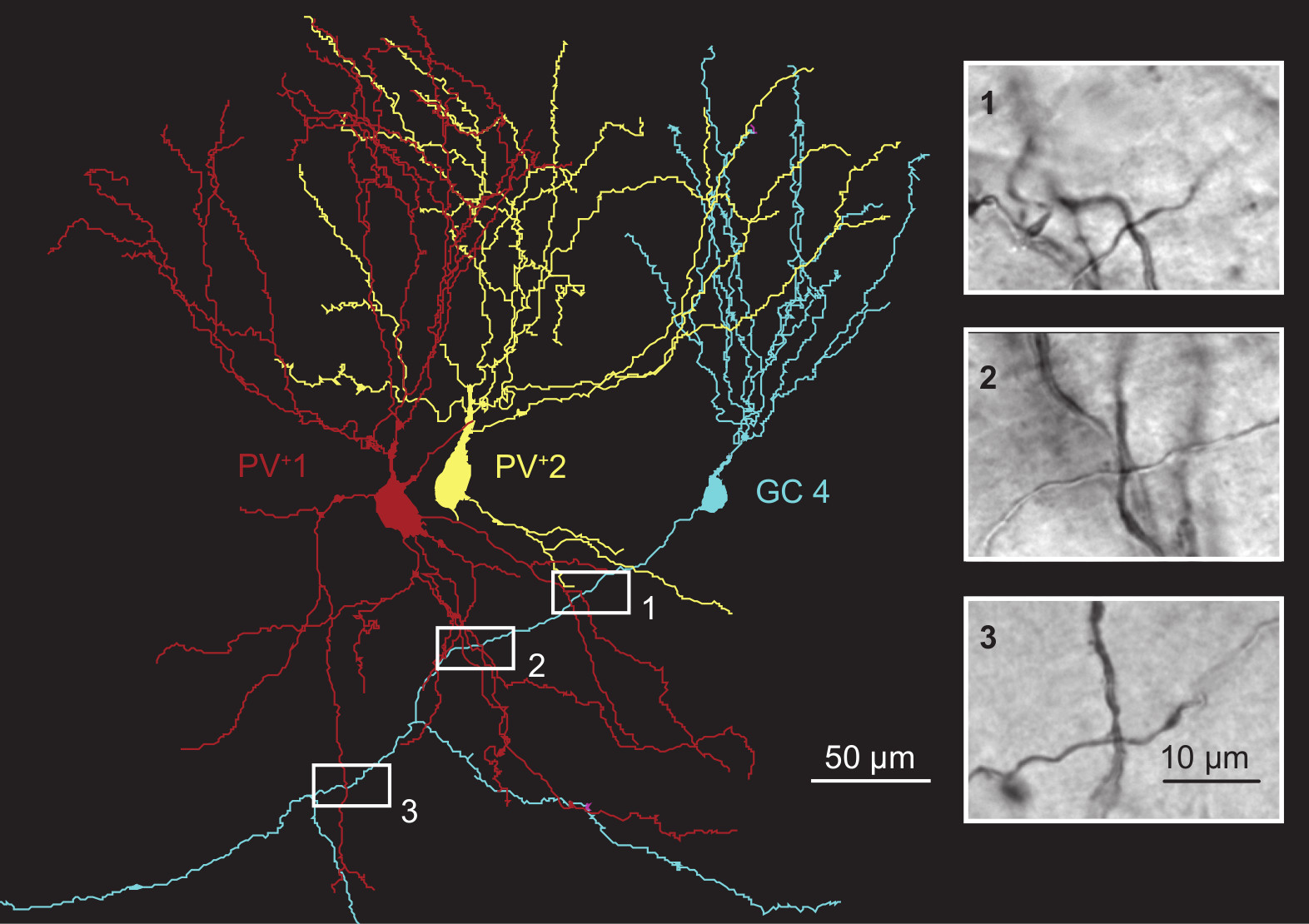 Parvalbumin+ interneurons obey unique connectivity rules and establish a powerful lateral-inhibition microcircuit in dentate gyrus. Claudia Espinoza, Segundo Jose Guzman, Xiaomin Zhang, and Peter Jonas. Nature Communications, 2018, DOI: 10.1038/s41467-018-06899-3