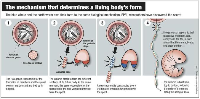 Uno de los autores de la investigación, el profesor de la EPFL y de la UNIGE, Denis Duboule, explica que “estamos formados por treinta y tantas capas horizontales, que se corresponden más o menos con el número de vértebras que tenemos” (en los seres humanos hay de 33 a 34 vértebras durante la etapa fetal y en la niñez. Durante la etapa adulta sólo hay 24, debido a que los huesos del sacro y el cóccix se sueldan convirtiéndose en un hueso cada uno).