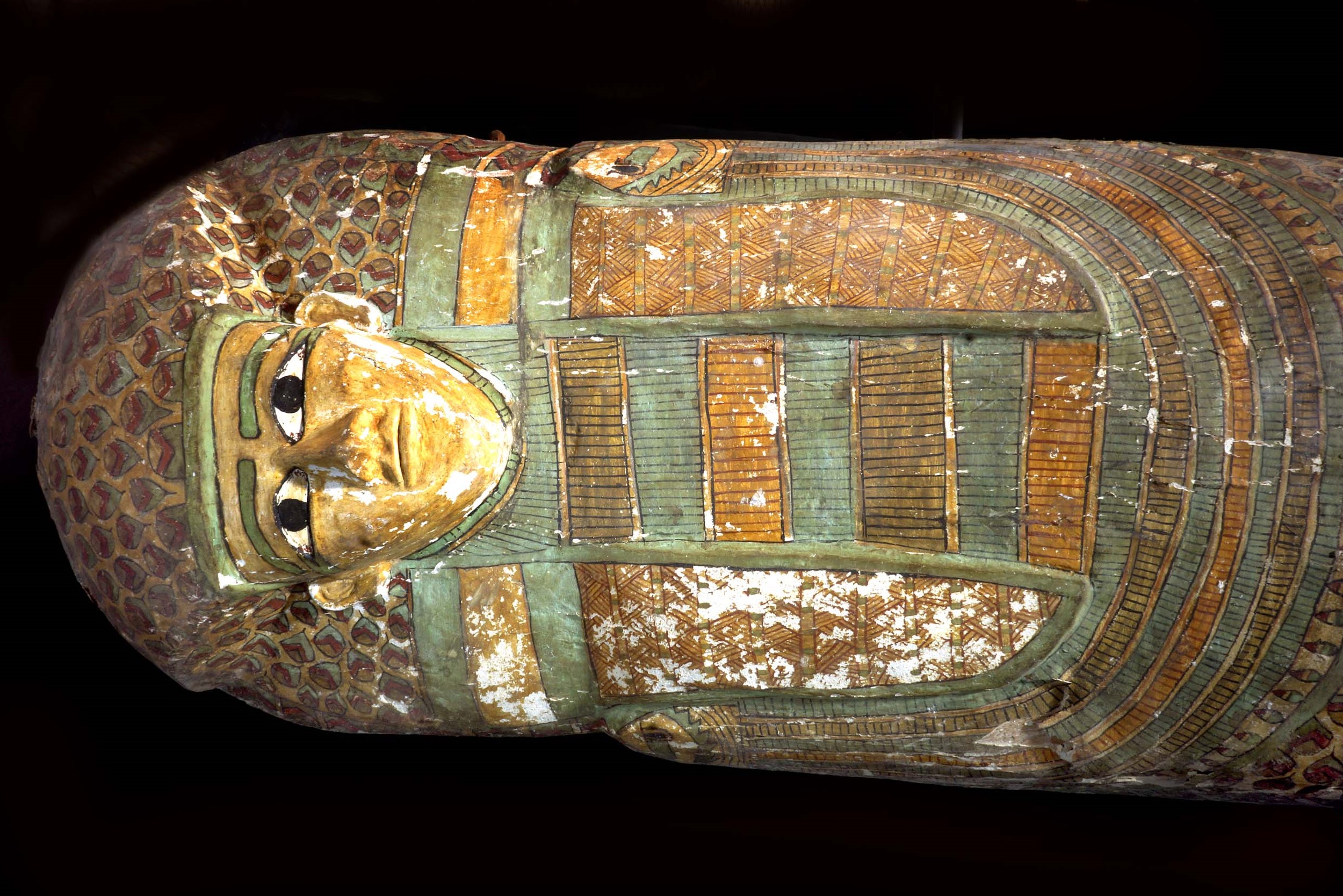 Una inscripción recorre desde el pecho hasta los pies la tapa del ataúd: dirige una invocación de ofrendas a un hombre llamado Neb. Su momia todavía se encuentra dentro de la caja y, aparentemente, en buen estado.