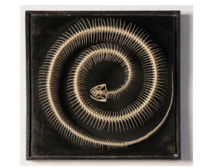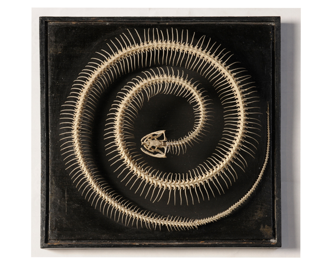 Esqueleto de una serpiente enroscada sobre sí misma, que acompaña al díptico 'Adán y Eva' de Durero. Fuente: CSIC.