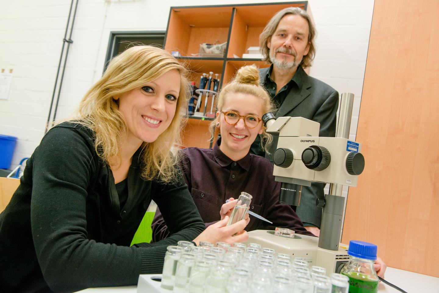 Linda Weiss (izquierda), Leonie Pötter y Ralph Tollrian, los autores de esta investigación. © RUB, Marquard.