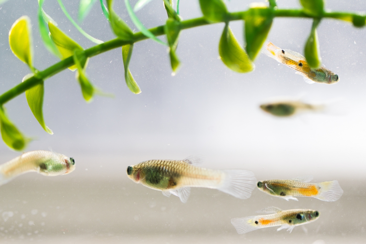 Guppys salvajes en un acuario con dos hembras a la izquierda y tres machos (más pequeños y con manchas de color naranja) a la derecha. Foto: Laura Chouinard-Thuly / Université McGill.