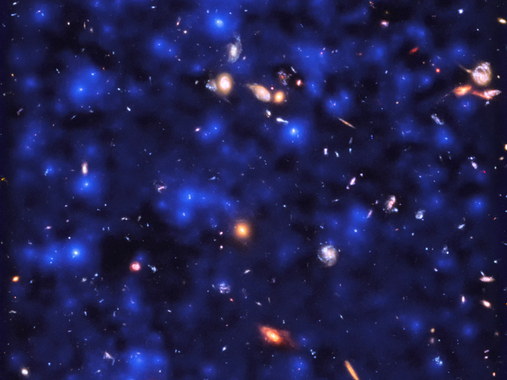 Esta detección de la emisión Lyman-alfa en el HUDF es la primera en la que los astrónomos han podido detectar la débil emisión de las envolturas gaseosas de las galaxias más tempranas. Esta composición muestra la radiación Lyman-alfa en azul superpuesta a la icónica imagen del HUDF.