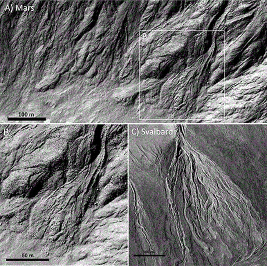 En 2014, por otro lado, investigadores de la Universidad de Gotemburgo, tras comparar las formas geológicas de un cráter de Marte con las de una zona de Noruega, señalaron que en el planeta rojo hubo agua líquida hace 200.000 años.