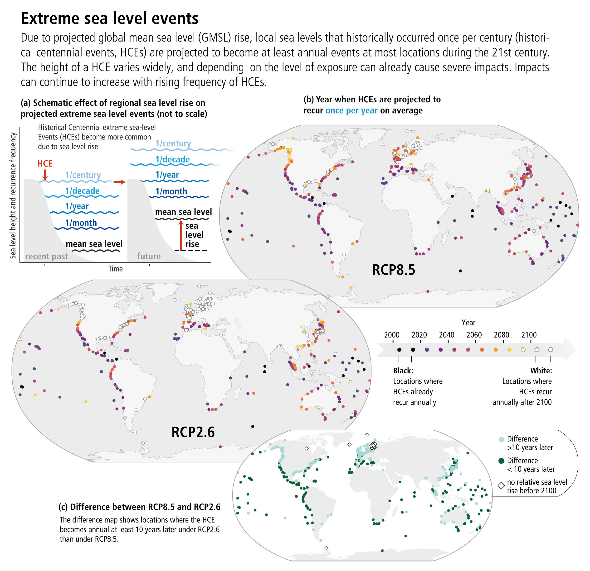 En 2100 el nivel del mar podría llegar a registrar una elevación de entre aproximadamente 30 y 60 cm, incluso aunque se logre una reducción drástica de las emisiones de gases de efecto invernadero y el calentamiento global se mantenga muy por debajo de 2°C. Sin embargo, si las emisiones siguen aumentando con fuerza, la subida del nivel de las aguas podría ser del orden de 60 a 110 cm.