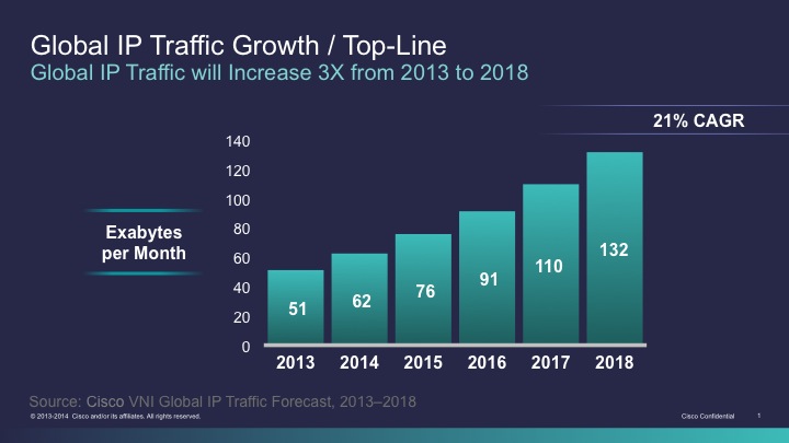 En 2018 el tráfico que cruzará las redes a escala global será mayor que la suma de todo el tráfico de años anteriores. Entre 1984 y 2013 se generaron 1,3 Zettabytes de tráfico IP a escala global; en 2018 se crearán 1,6 Zettabytes.