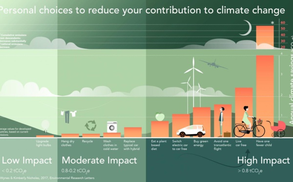 Dieta vegetariana, evitar el avión, no usar el coche y tener menos hijos reduce las emisiones individuales de CO2 en más de 60 toneladas al año, según un estudio, que considera las políticas oficiales de usar bombillas de bajo consumo o de reciclar como meramente simbólicas, ya que son cuatro veces menos eficaces que una dieta vegetariana.